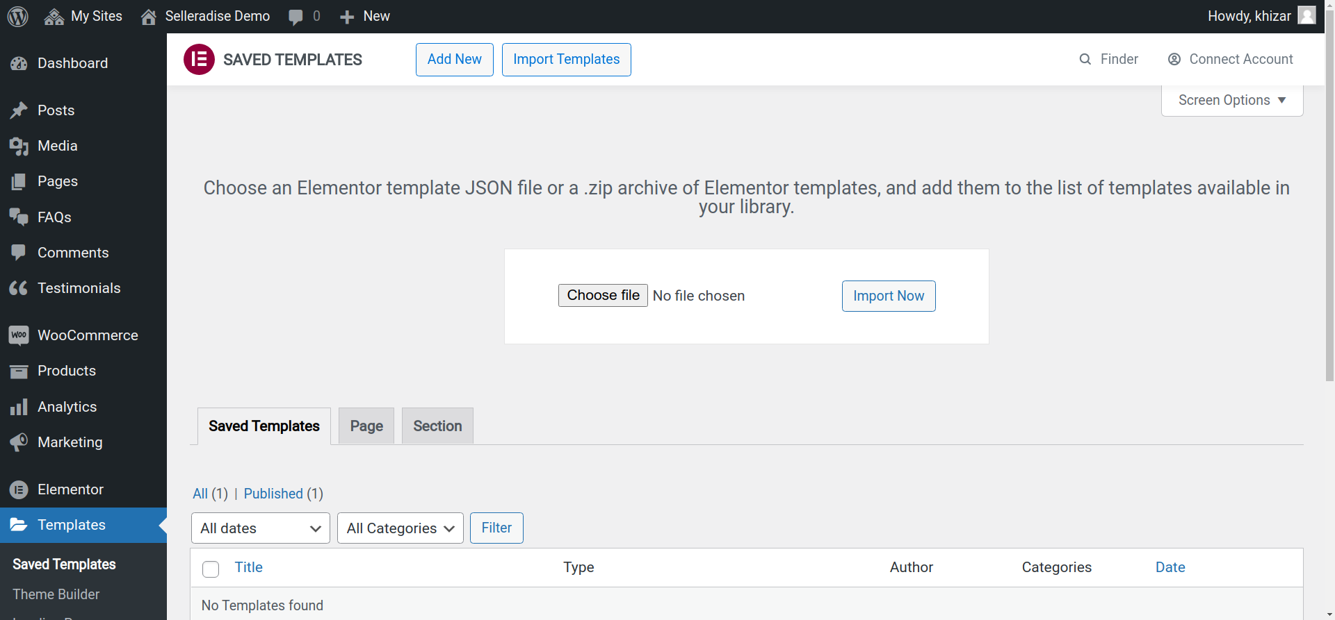 Choose the template file from your computer provided in selleradise-demo-data.zip. For Fashion demo, it should be ** selleradise-demo-data > fashion > elementor-template.json**.